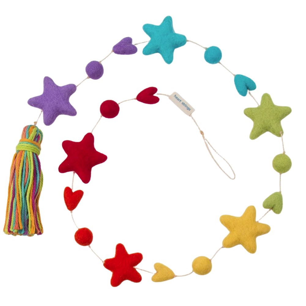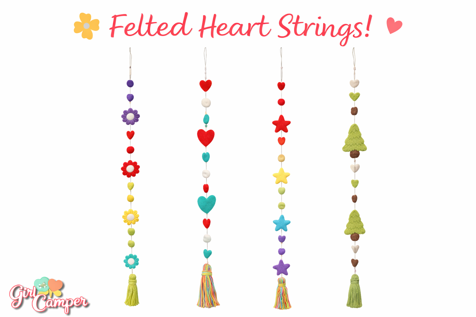 Unique handmade wool felted Heart Strings add a pop of color and love to any camper, tent, car, wall, window, or door. Each is approximately 32 to 39 inches long.